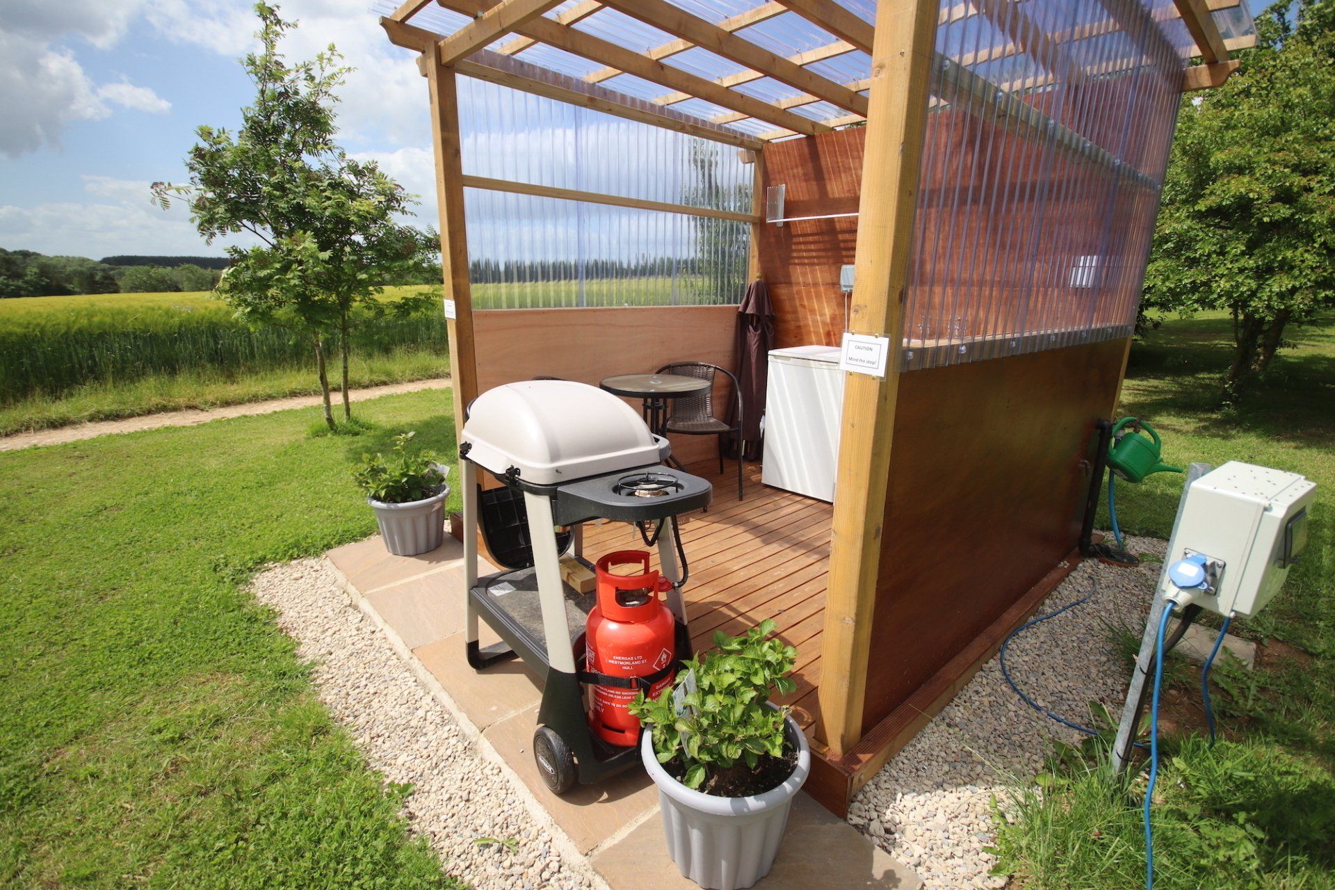 True camping but with a full size double bed and bedroom furniture for a more comfortable nights sleep. Outside there's a gas BBQ to cook on, picnic table and pitch side kitchenette with washing up facilities and fridge.